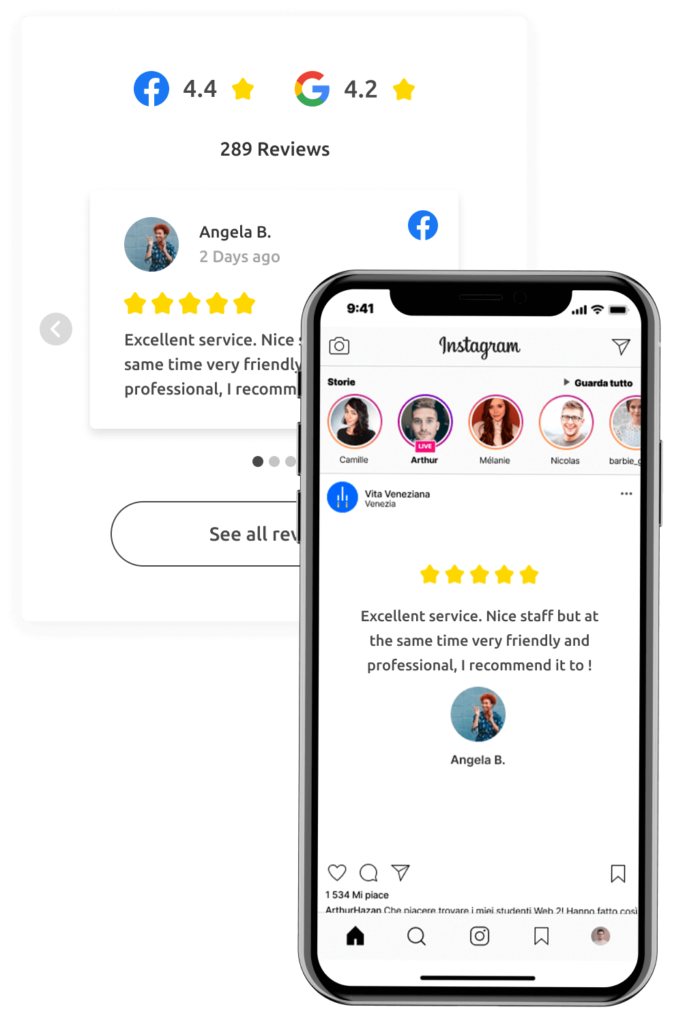 Share the best reviews on your Facebook or Instagram page via customizable templates.
